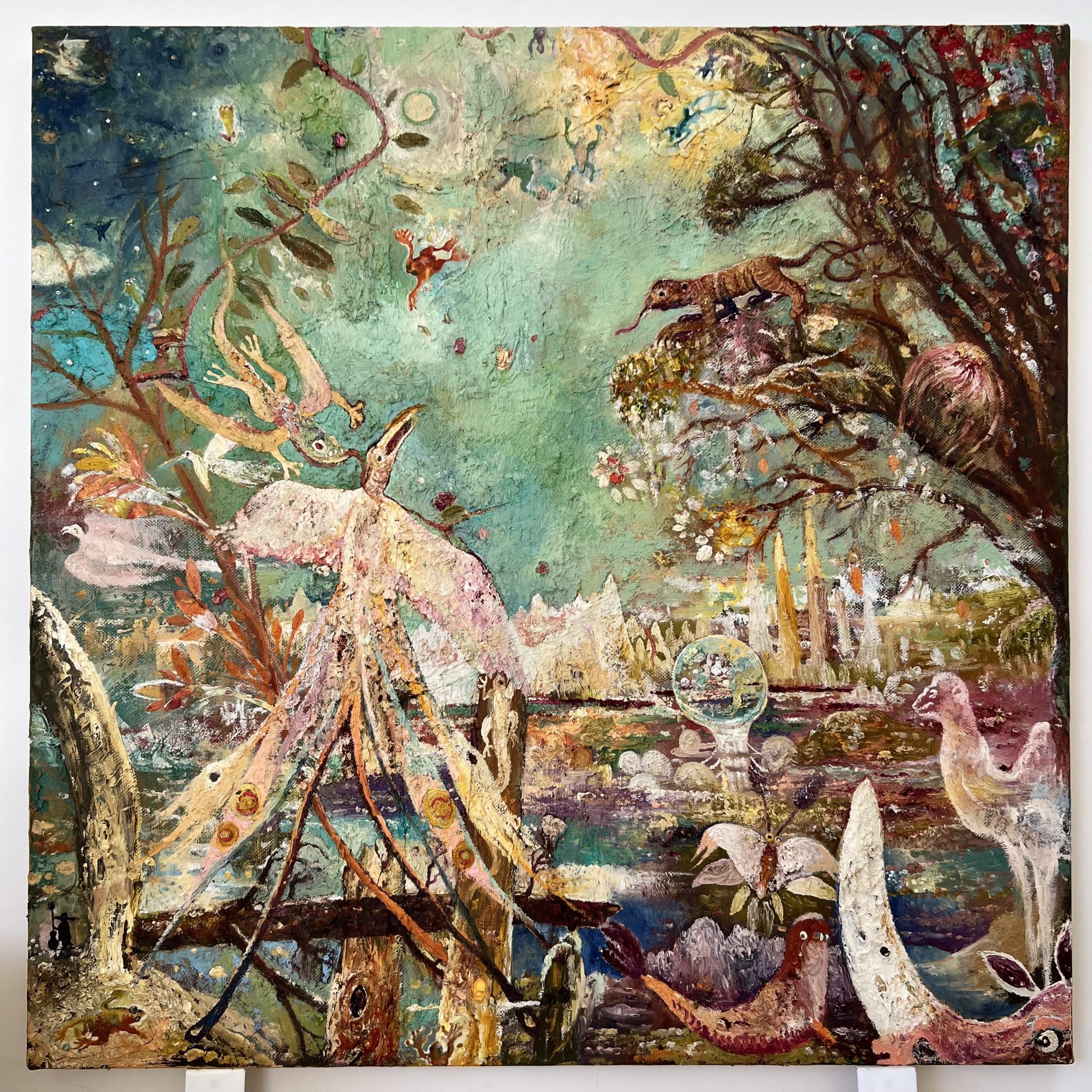 Peter Burns, Enchanted Forest, 92 x 92 cm (3cm depth) oil on hessian, 2025