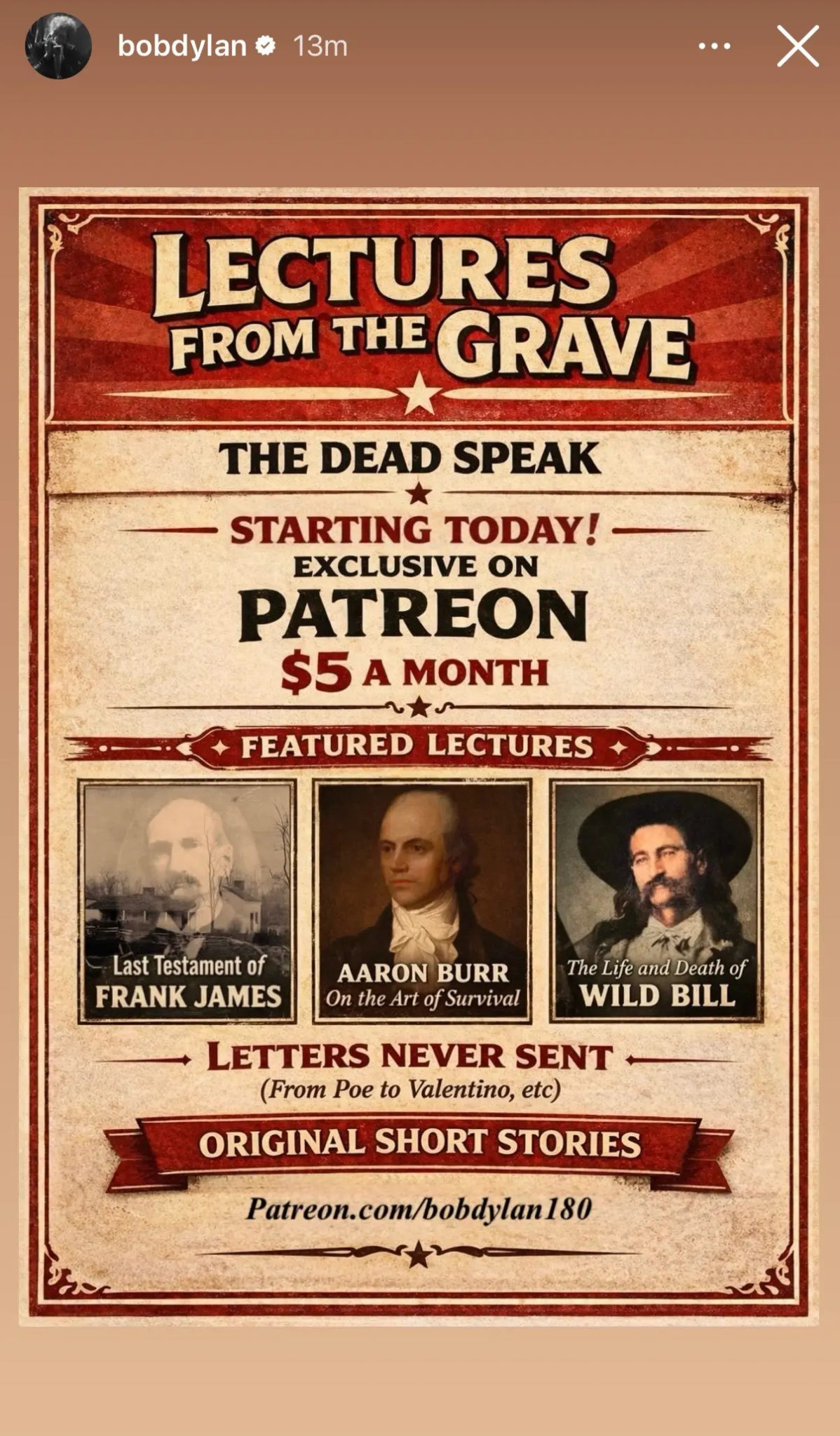 @bobdylan via Instagram.The current featured lectures include "Last Testament of Frank James", "Aaron Burr: The Art of Survival", and "The Life and Death of Wild Bill." These audio recordings, some of which are over an hour long, take the perspective of these long-dead historical figures.