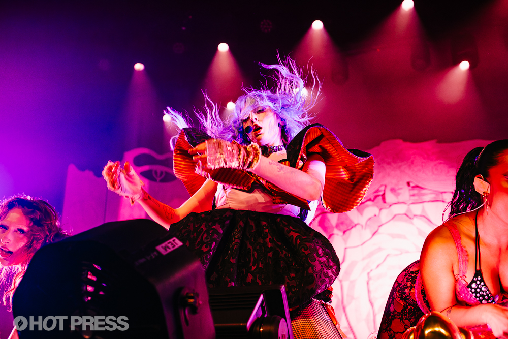 Ashnikko at 3Olympia Theatre on February 17th, 2026. Copyright Abigail Ring/ hotpress.comWith more props being brought out by the dancers, such as the 'trinket trunk' and crow beaks, the stage turned more and more into Alice in Wonderland-esque trippiness. There was a scary, modulated voiceover, appearing every now and then, introducing you to the Smoochie world from the bottom of ASHNIKKO'S purse. The choreography combined the expressiveness of mime, with the theatrical flair of a burlesque show.