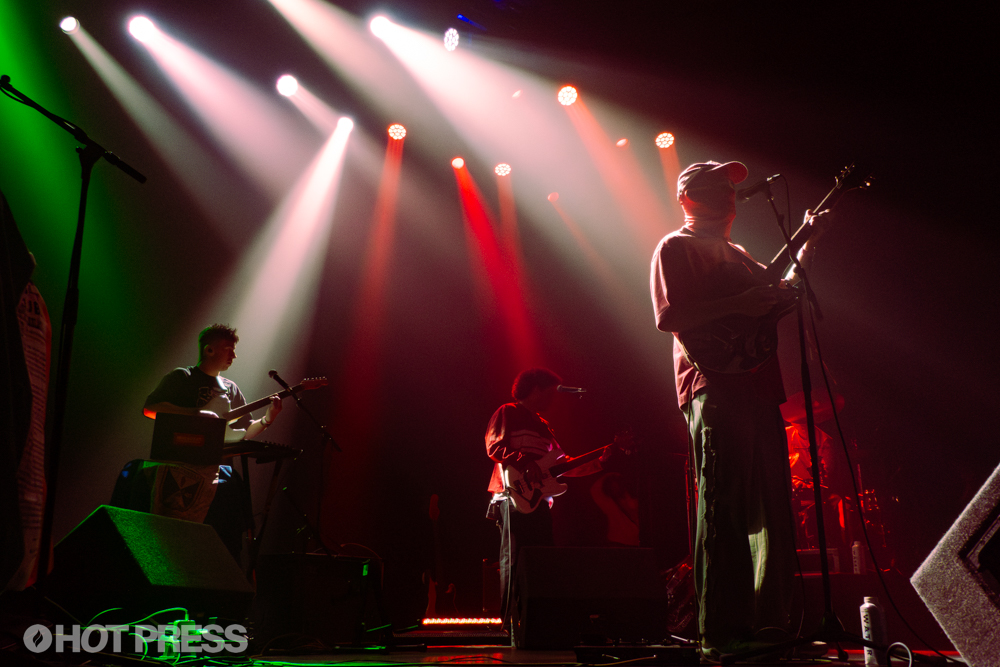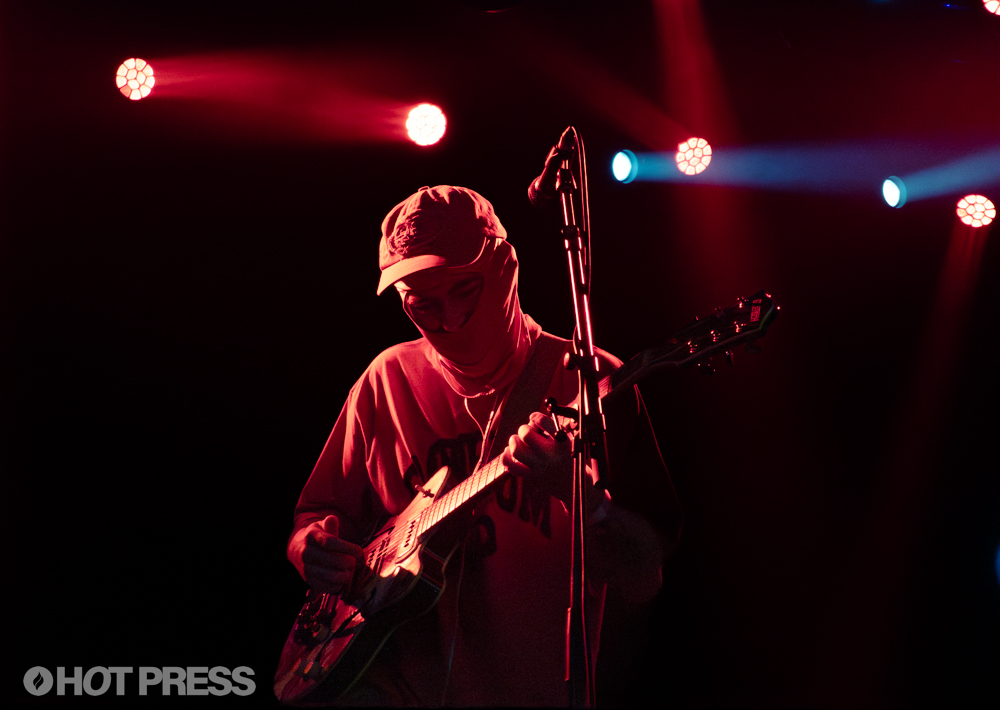 Bricknasty at 3Olympia Theatre on December 6th, 2025. Copyright Grace Swartout/ hotpress.comClad in his usual pink balaclava, as well as a matching hat and t-shirt, the responsibility of vocals and guitar don’t seem to phase him in the slightest. He makes his craft seem effortless, as though creating such a unique sound is as simple as cracking a knuckle.