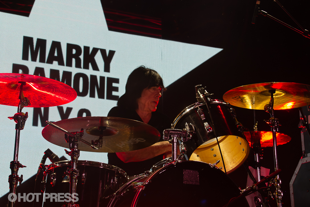 Marky Ramone comes out and walks downstage, out in front of the audience, and spreads his arms wide, greeting the crowd. The crowd’s cheers grow even louder. Marky turns and returns to his center stage post behind the drum kit, as the audience starts chanting again.