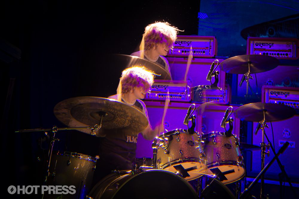 Shark School comes out and deliver a fun, energetic set, only stopping briefly to introduce themselves (and later for a quick joke about why their pyrotechnics didn’t show up: they were fired). There are a few devotees to the up-and-coming punk band in the audience, who sing along to every song elatedly, filming the band on their phones. Standing close to the front, you can feel the nonstop pulse of the drums and bass in your chest. Even the tamer audience members are bobbing their heads by the end. Shark School, who are visibly enjoying themselves onstage, grinning at each other as they sing, close out their set with a lively rendition of their song ‘Choose Life’.