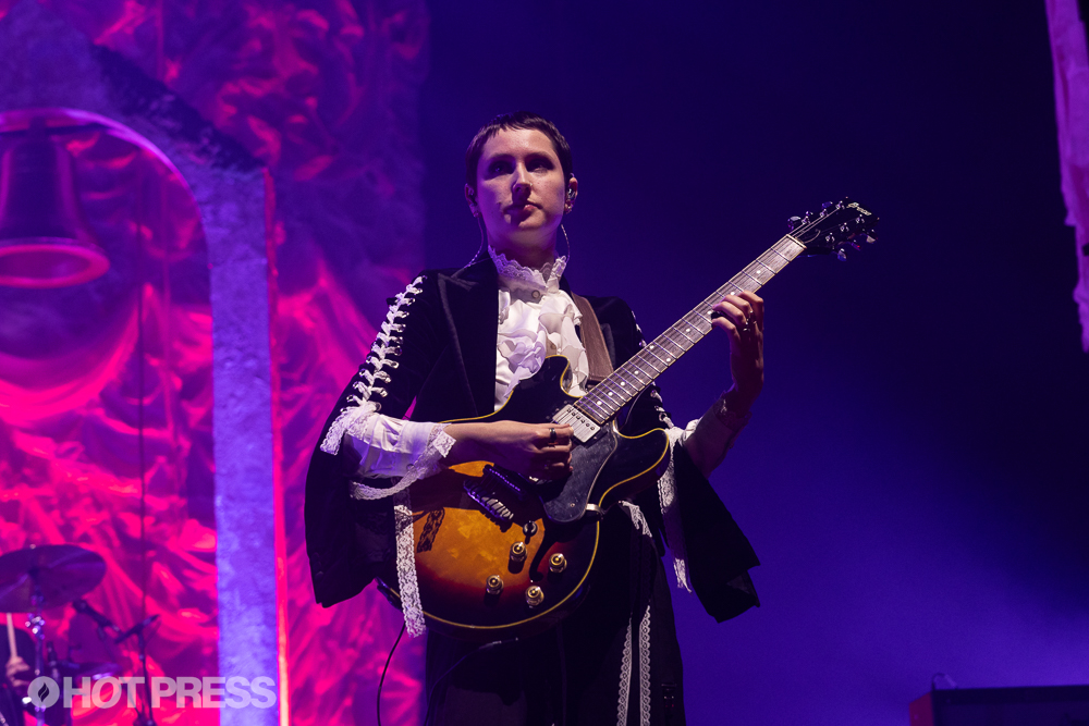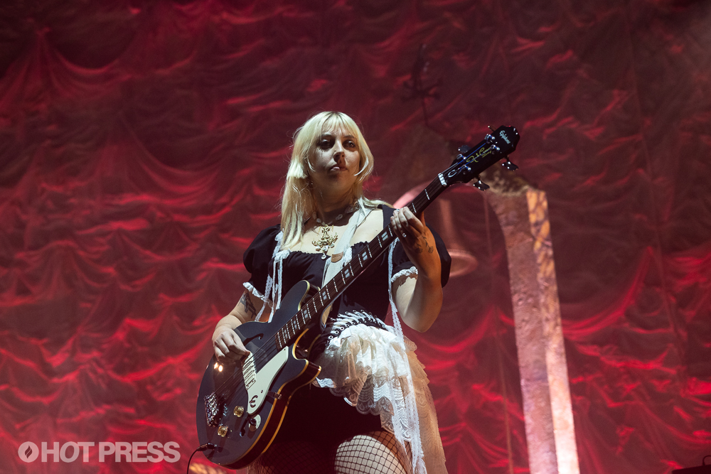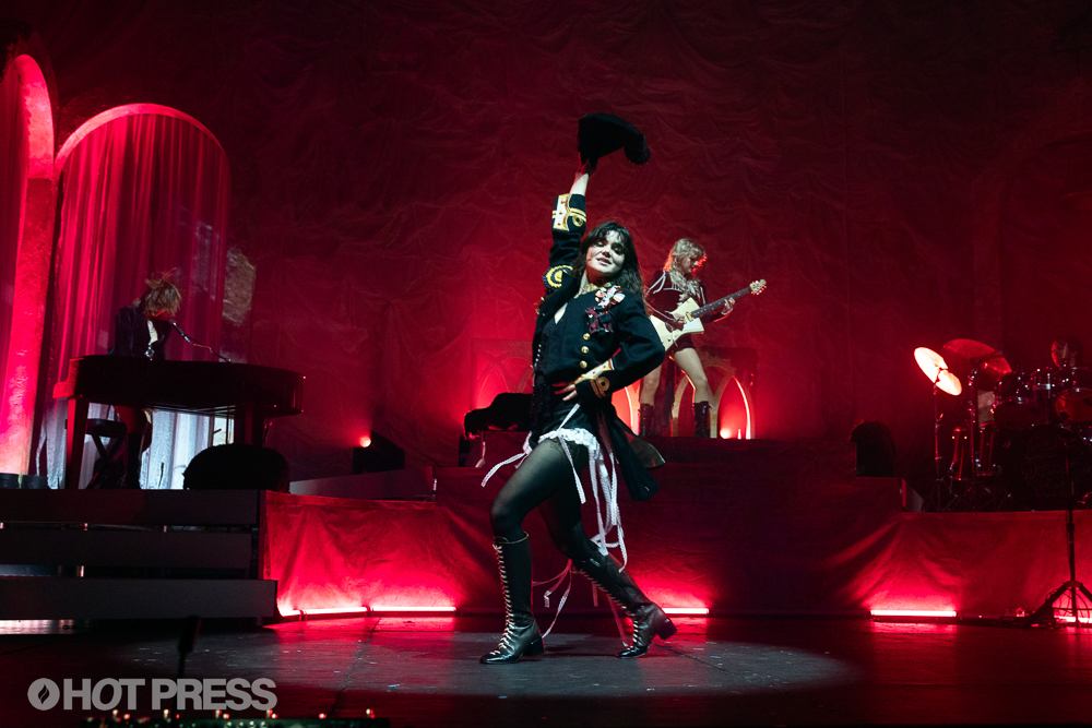 The Last Dinner Party at 3Arena on November 14th, 2025. Copyright Peter OHanlon/ hotpress.comBetween the over-the-top decor, the sonic mastery, the band’s incredible charisma and the perfectly placed elevated platform in the centre of the stage, on which each band member goes to stand on separate occasions, seeing TLDP live in Dublin almost feels like being in Church – a raucous, incredibly fun and irrepressibly queer Church, in which references to lesbian sex are treated like a prayer. To punctuate the feeling, guitarist Emily Roberts performs the guitar solo on ‘Mirror’ while standing on said platform, while the rest of the group kneel in front of her.