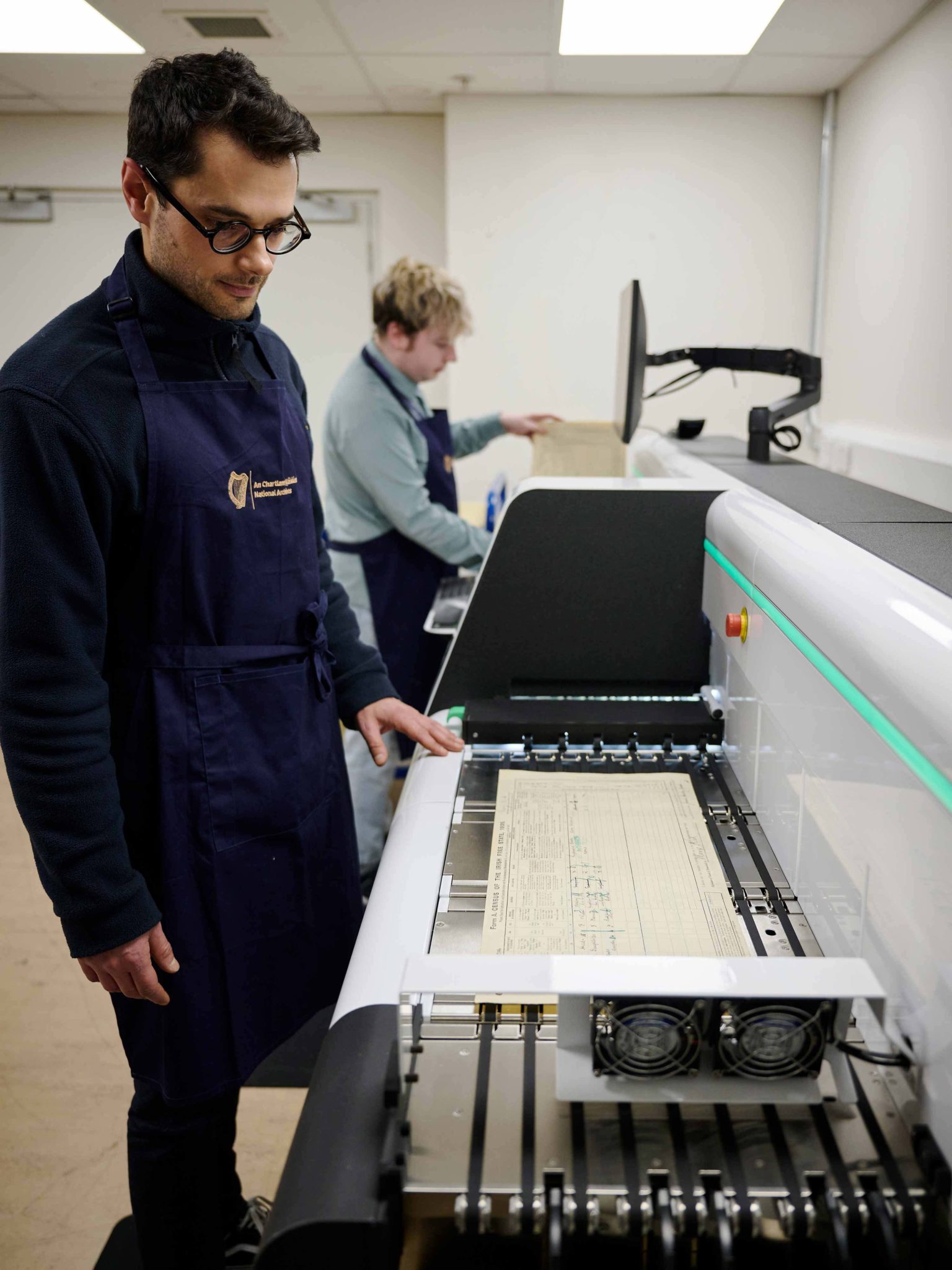 “All the books,” Orlaith explains, “were bound by lace, so we had to take the lace off all 2,400 books. Then every page went through a conservation surface clean, and about 70,000 pages needed direct intervention of mending. Every page went through digitisation. So, we had a team of six doing conservation and a team of six doing digitisation, taking two-and-a-half and three years respectively. We then used OCR (Optical Character Recognition) to help us with the transcription, but we still had a team of 50 checking and re-checking every entry.”