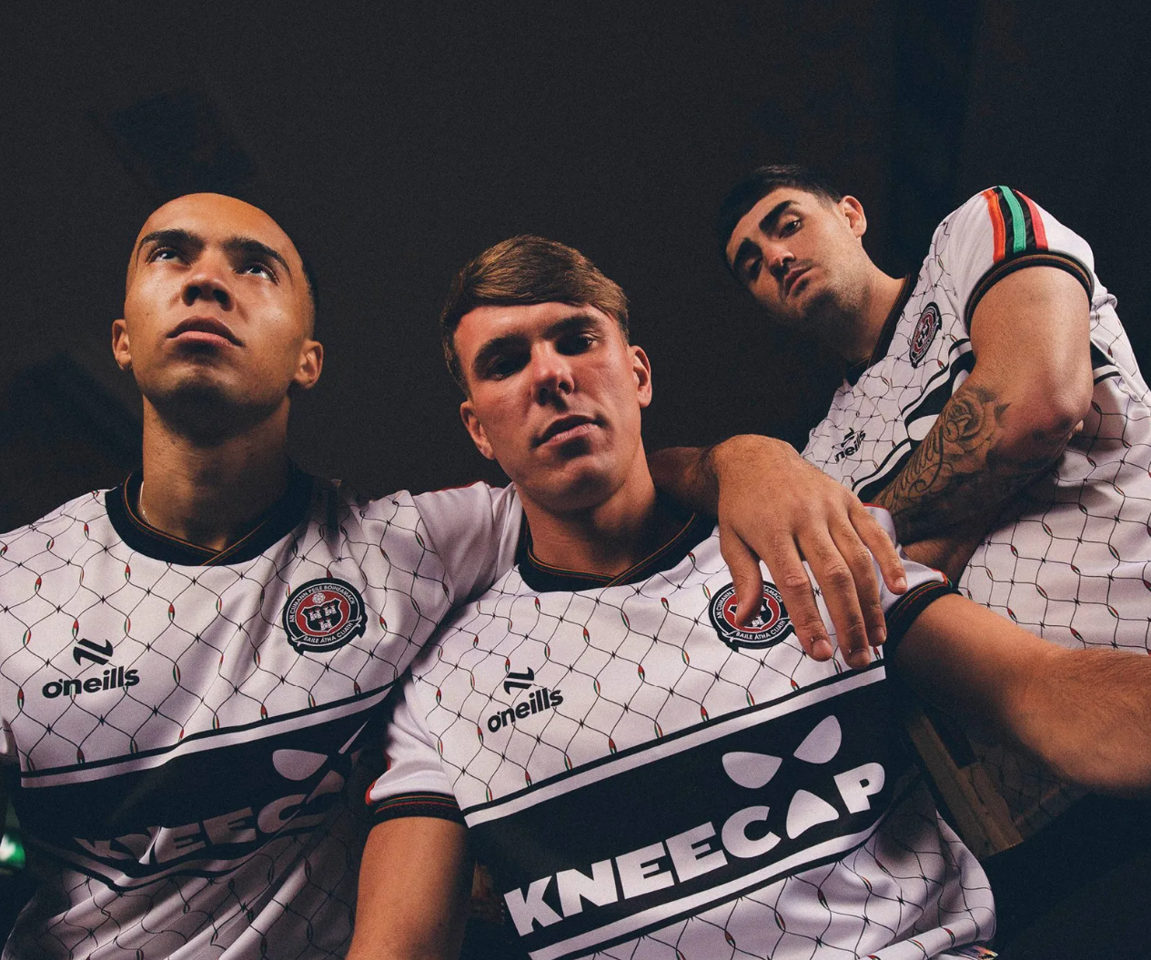 The Bohemian FC x KNEECAP jersey is available to purchase at Dalymount Park in Dublin today, December 17, until 7pm. Remaining shirts will be go online at 12pm on December 18.