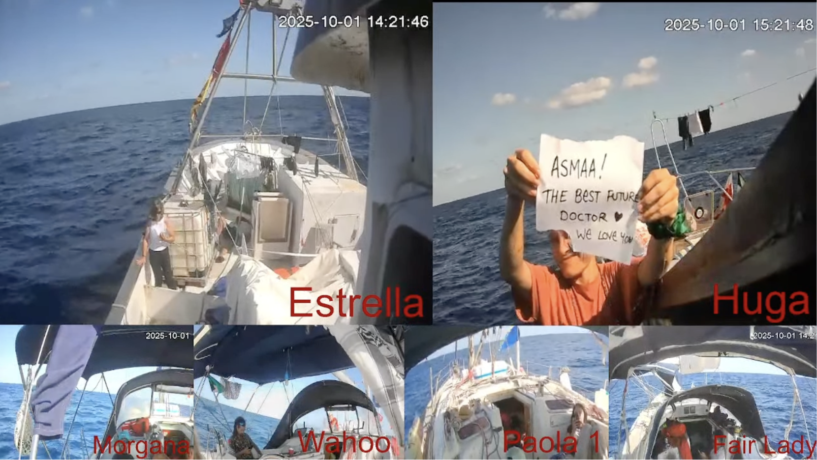 The livestreams show activists on board watching the horizon and occasionally acknowledging the camera. At one point, an activist aboard the Huga boat held up a sign to the camera reading "Asmaa! The best future doctor, we love you."