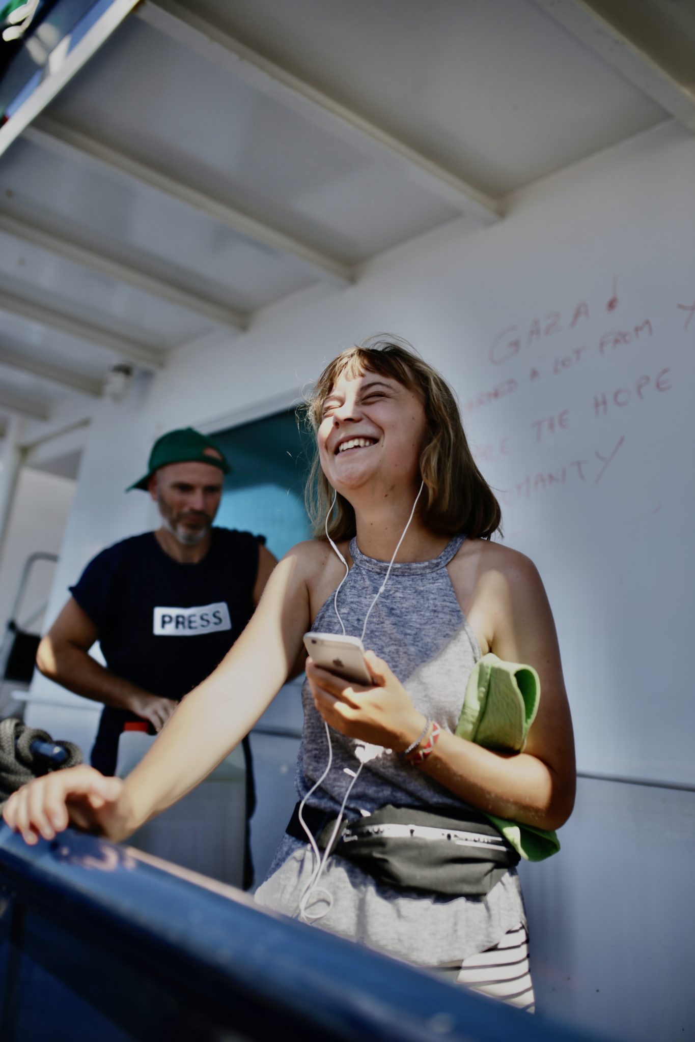 GSF Volunteers Greta Thunberg and Tadhg Hickey. Photo: Carlos Pérez Osorio.In the face of ethnic cleansing, occupation and hermetic siege, it seems then that the only counter to the dehumanisation of Palestinian life- and love of their children and each other- is to commit to assuming even a small part of the risks they face, daily, in their struggle to exist, their struggle to live lives far beyond survival.