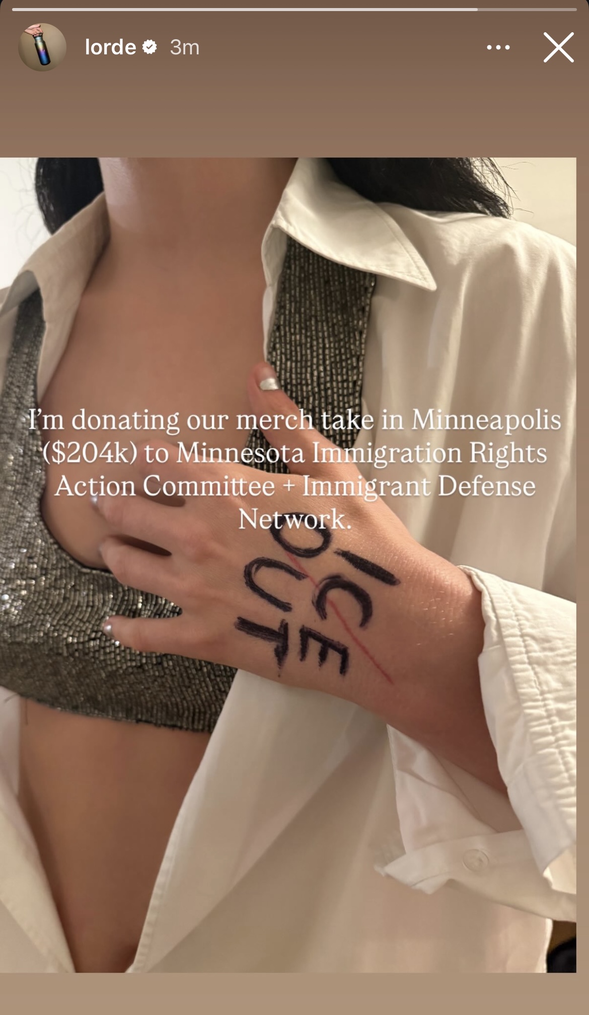 Lorde has announced she will be donating $204k (€173k) in merch proceeds from her Minneapolis show to the Minnesota Immigration Rights Action Committee and the Immigrant Defense Network.